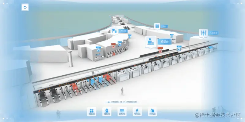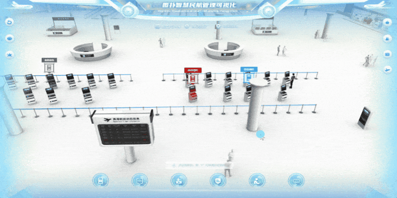 图扑软件 HT 作为基于 HTML5 的 2D、3D 图形渲染引擎,应用丰富的动画展现形式。搭建了自助值机、乘机安检、检票登机等三维动画。通过对接现场先进设备的运行数据,实时展示了旅客自助打印机、单人检验台控制台、安检合规等的操作流程。通过前后端数据的互融互通,帮助机场进一步实行“一脸一码”轻松过检,减少多环节的身份查验和近身检查,提高通关的舒适感和自在感。