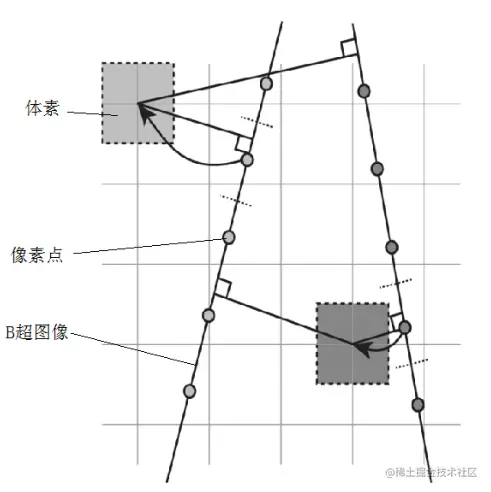 邻域的形状常见有球体、正方体等等,也有使用经过该体素的两条法线找到与其距离最近的两帧二维超声图像(分布于该体素两侧),记录法线和超声图像的交点和距离,并在两帧二维超声图像中找距离最近的像素值加权平均来赋值,如图所示。