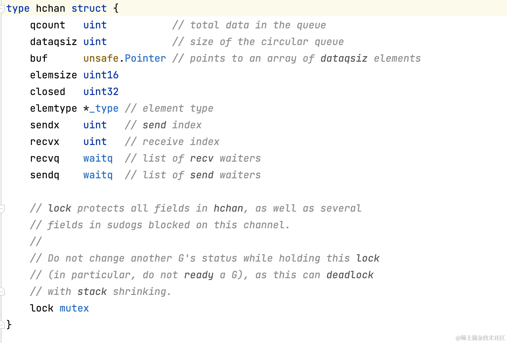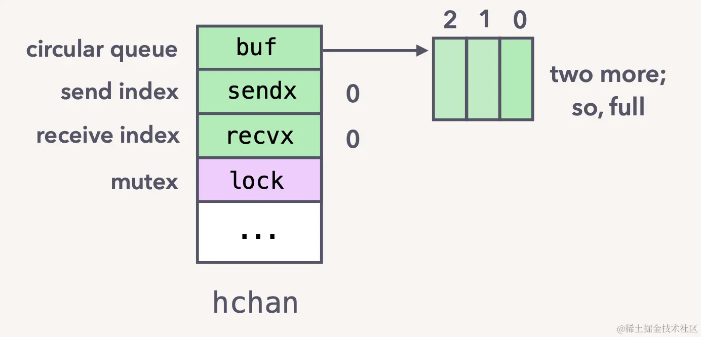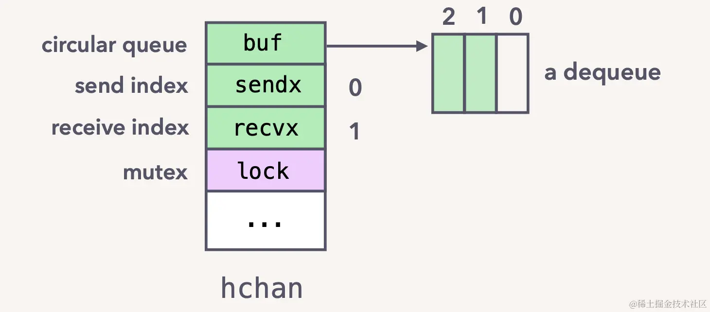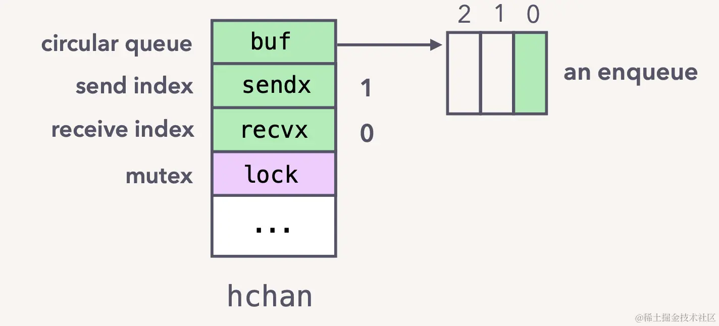 其中可以看到, 核心包括一个 lock 控制并发, 等待发送的队列, 等待接收的队列, 队列大小, 队列元素指针, 是否关闭