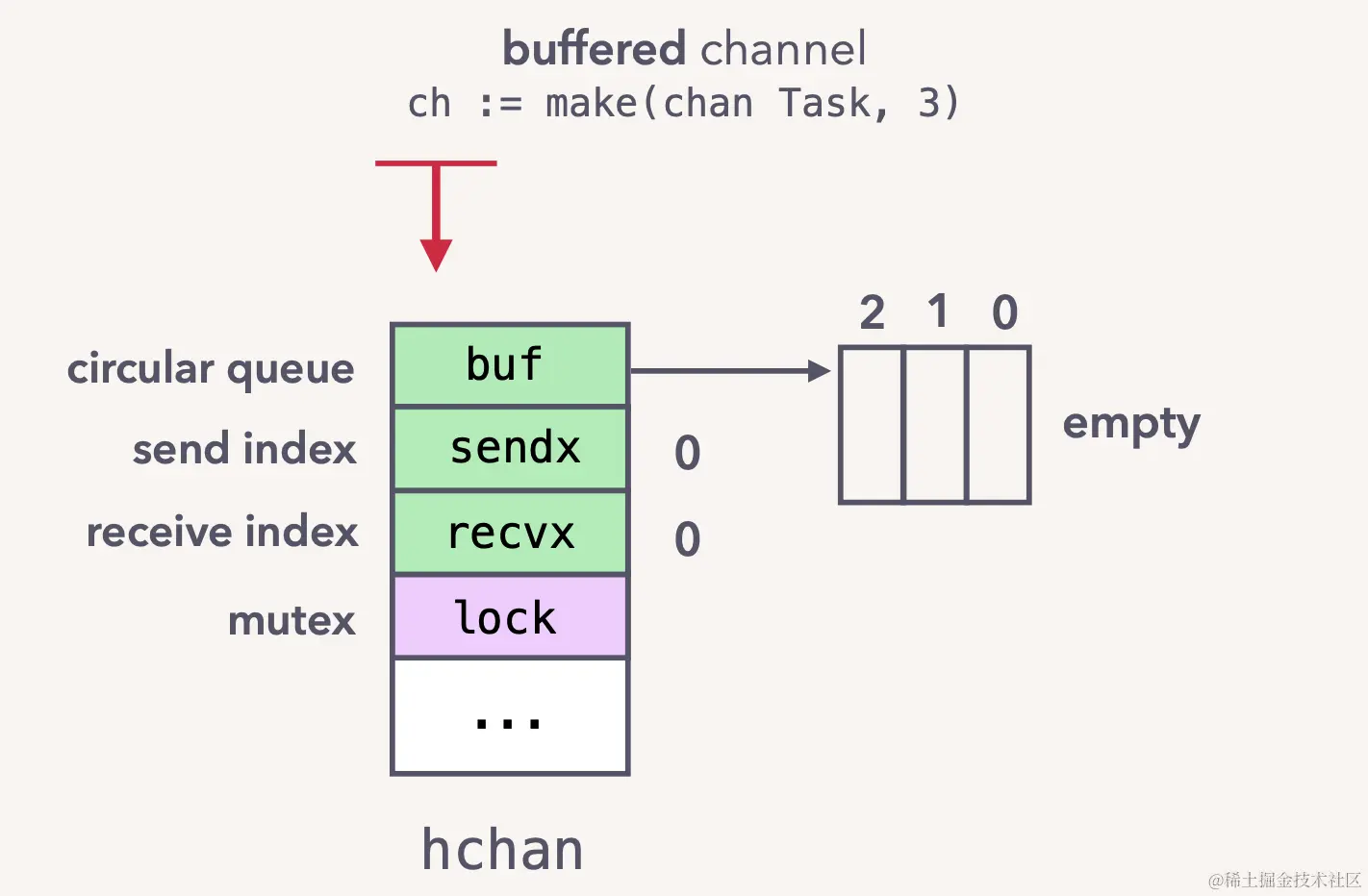 从 channel 的功能来看「暂时只考虑带缓冲区的 channel」, 其实是一个队列, 往 channel 发数据和接收数据需要保证并发安全。具体实现可以使用一个有锁的数组「所以, 从性能上来看, 使用 channle 未必比直接使用 mutex 性能更好」, 同时调度 channel 对应的接收 goroutines 和发送 gotoutines。