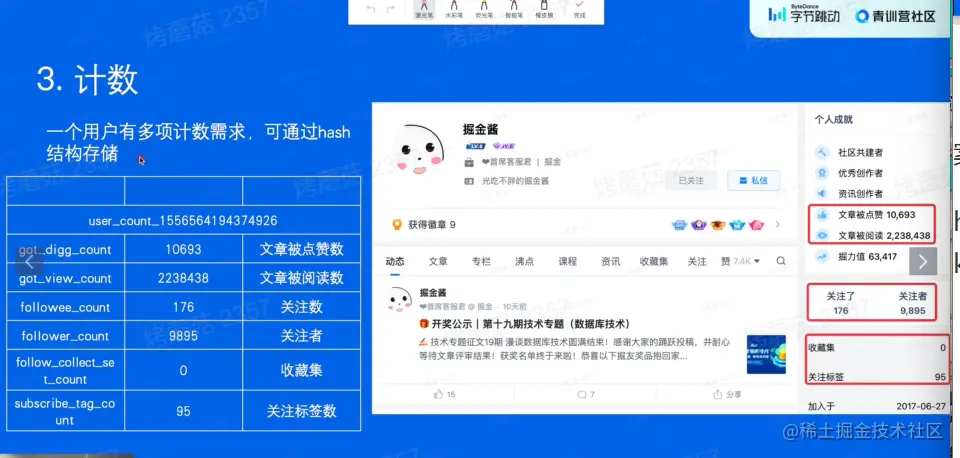 hash数据结构 如果一个用户存那么多信息就太多个key了。可以用一个用户id存key hash结构,存一堆关联数据。