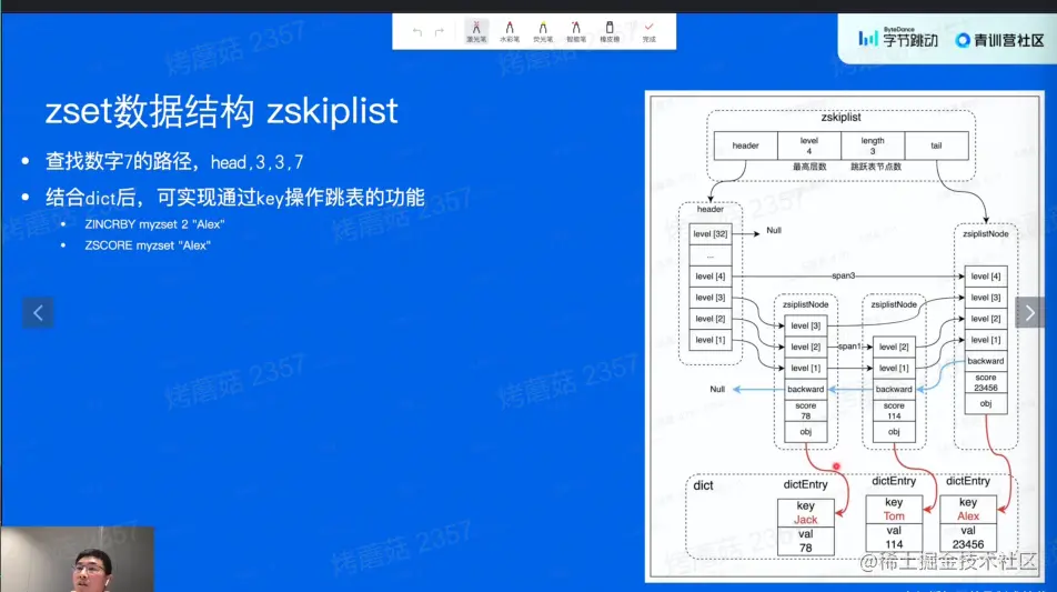 数据结构:zset 跳跃表,找的比较快,两次找到7,