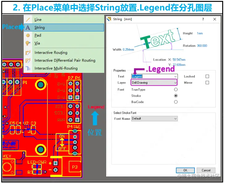 二、放置分孔图表: 在Place菜单中选择String放置“.Legend”(快捷键P-S)在DrillDrawing(分孔图层),位置在板子右边或上方。