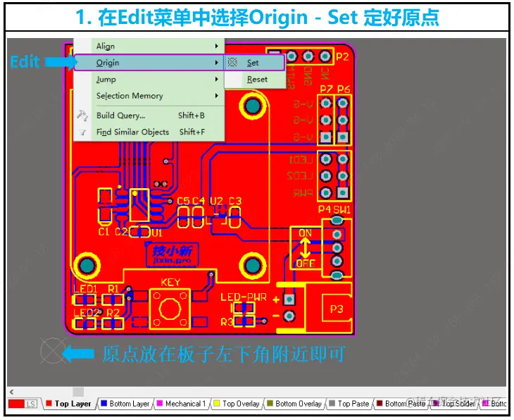 一、定义原点: 在Edit菜单中选择Origin-Set (快捷键E-O-S)定好原点,一般放在左下角附近即可。