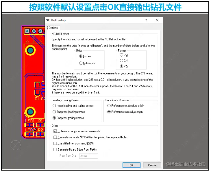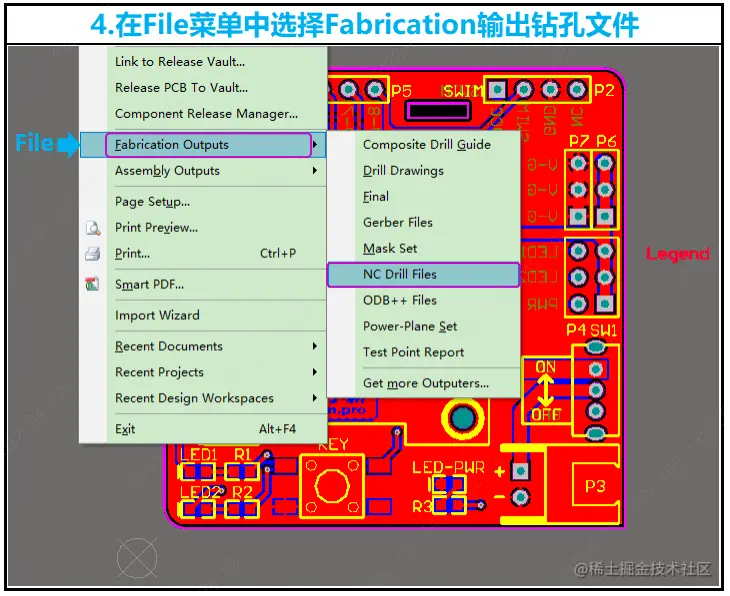四、输出钻孔: 在File菜单中选择Fabrication Outputs-NC Drill Files输出钻孔文件