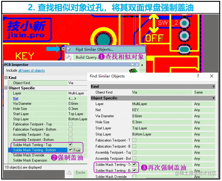 2. 右键单击选择这个过孔(via),然后选择“Find Similar Objects”查找相似目标,再把“Solder Mast Tenting-Top/Bottom”后面的两个框都勾选上OK确认,最后再确认选择一遍就可以了