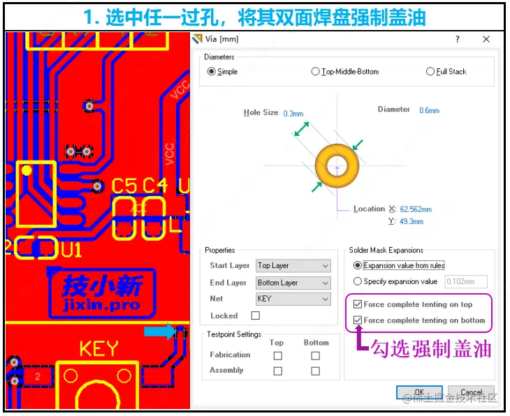 - 双击任一过孔(via),把"Force complet tenting on top/bottom"选项前面的两个框都勾选上:勾选了TOP表示顶层焊盘强制盖油;勾选了BOTTOM表示底层焊盘强制盖油