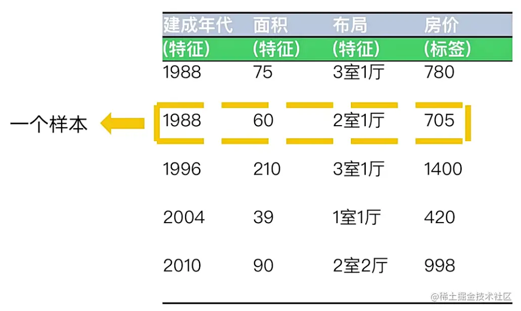 样本: 数据集的一行。一个样本包含一个或多个特征,此外还可能包含一个标签。