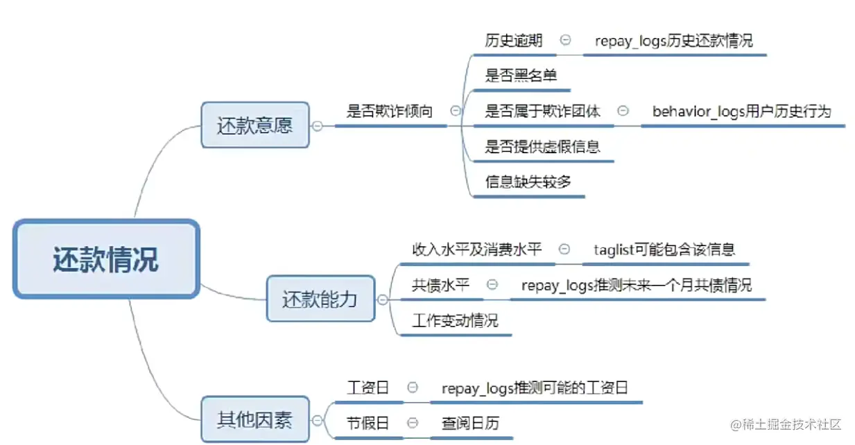上图中我们把影响用户还款情况的因素分成了3部分:还款意愿,还款能力以及其它因素。用户的还款意愿强弱,是直接影响用户还款情况的,比如用户是否存在欺诈倾向,这时候我们可以查询该用户是否黑名单、是否是欺诈团体、所提供的信息是否真实等。还款能力也会影响到用户的还款情况,比如收入水平、消费水平、共债水平(即用户可能多平台借款)、工作变动等。其他因素主要是工作日和节假日。