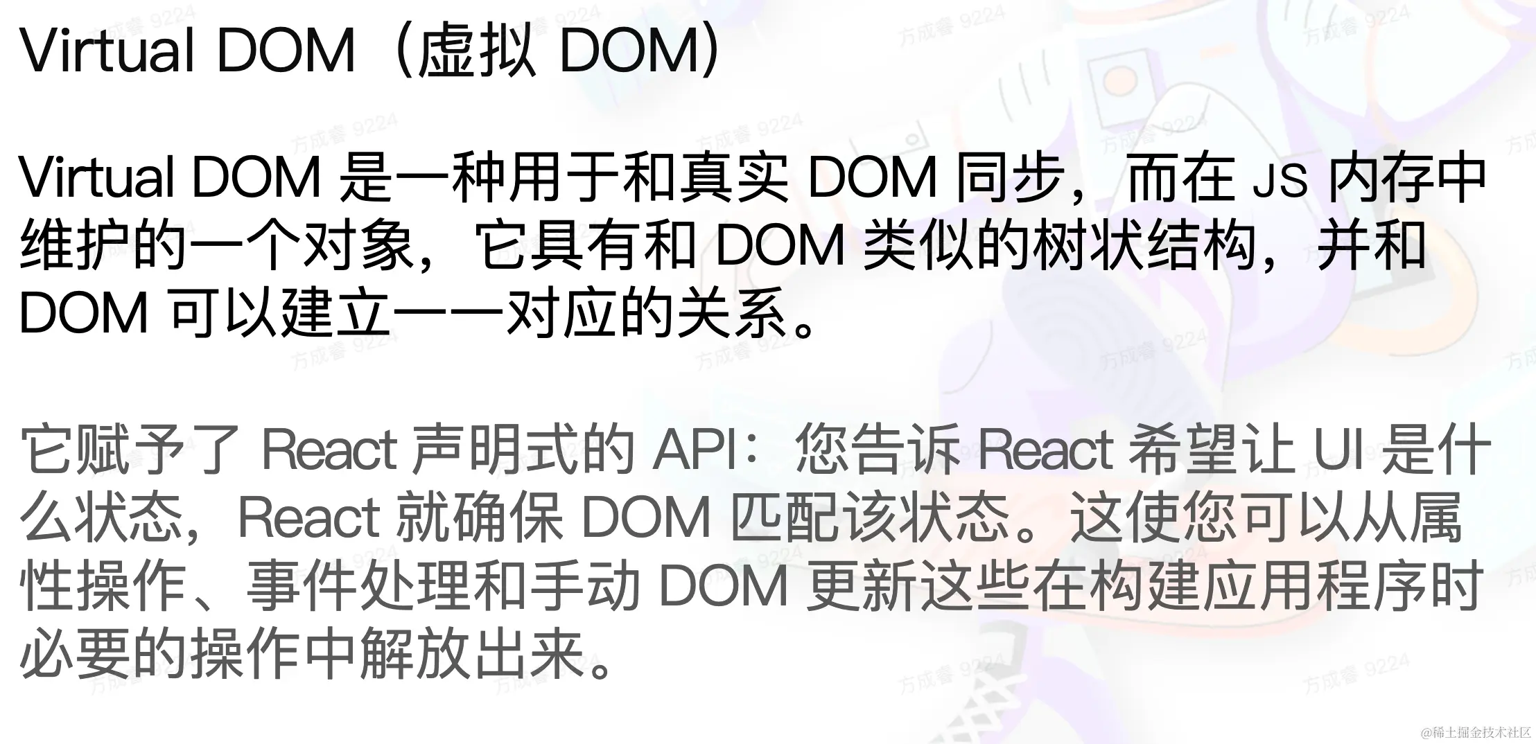 虚拟 DOM:React 使用 Virtual DOM 技术来优化 UI 渲染性能,可以避免频繁的 DOM 操作和重绘,提高页面渲染速度和用户体验。