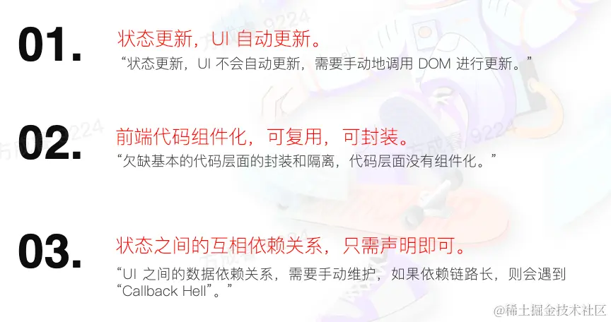 - 更可读:声明式编程让代码更加直观和易懂,开发者可以更快地理解代码的意图。