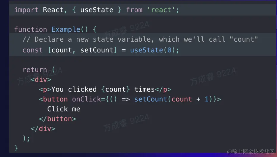 useState 允许我们在函数组件中定义 state,并返回一个数组,其中第一个值是当前 state 的值,第二个值是更新 state 的函数。我们可以调用更新 state 的函数来改变 state 的值。