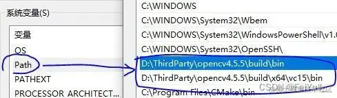 并将路径:"D:\ThirdParty\opencv4.5.5\build\bin" 和 "D:\ThirdParty\opencv4.5.5\build\x64\vc15\bin"添加到环境变量,如下图: