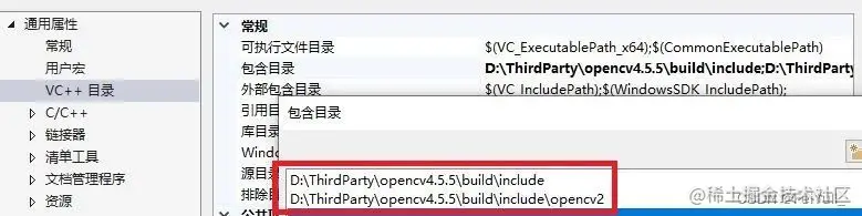 step6:选择:[通用属性] -> [VC++目录] -> [库目录] -> [编辑] -> 将路径:"D:\ThirdParty\opencv4.5.5\build\x64\vc15\lib"拷贝进去 -> [确认]