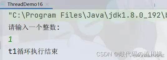 构造一个myCounter类,成员flag,让t1线程中的循环条件为新创建的对象flag,让t2通过输入的整型值,控制flag的值,若非0,则t1循环应该终止!