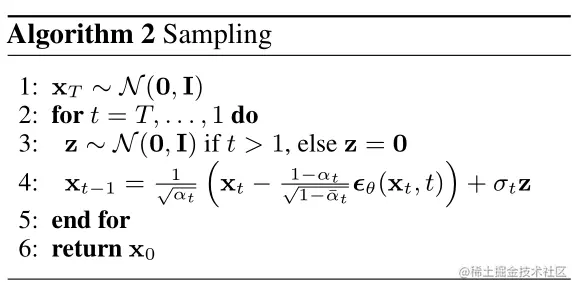 模型训练好之后,在真实的推理阶段就必须从时间步 T 开始往前逐步生成图片,算法描述如下: