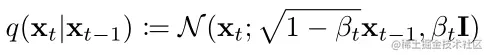箭头下方的 q(xt|xt-1) 则表示一个以前一个状态 xt-1 为均值的高斯分布,xt 从这个高斯分布中采样得到。