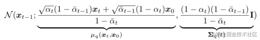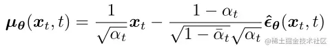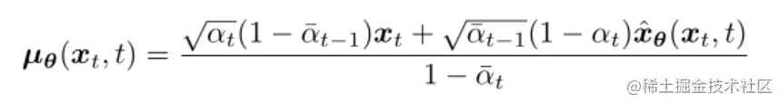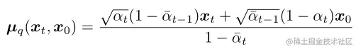代入上面 q(xt-1|xt, x0) 的均值式子中可得(推导过程详见参考资料[4]第15页):