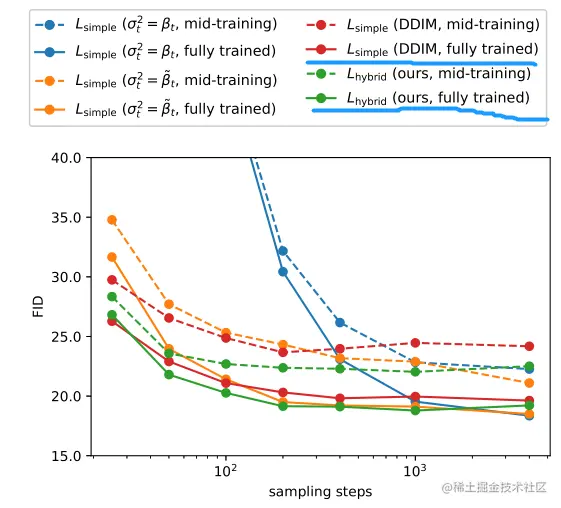 关注画蓝线的红色和绿色实线,可以看到采样步数从 1000 缩小到 100 指标也没有降多少。
