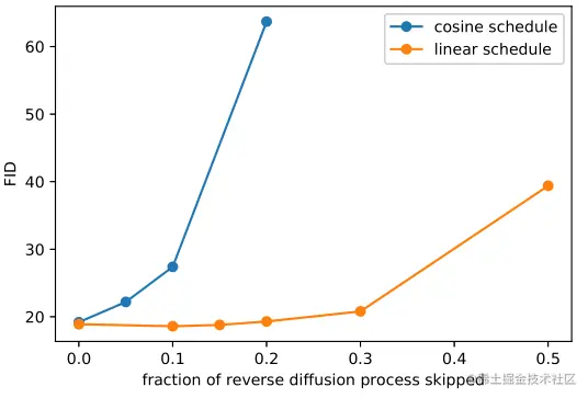实验结果表明,针对 imagenet 数据集 64x64 的图片,原始的策略在做反向扩散的时候,即使跳过开头的 20% 的时间步,都不会对指标有很大的影响。