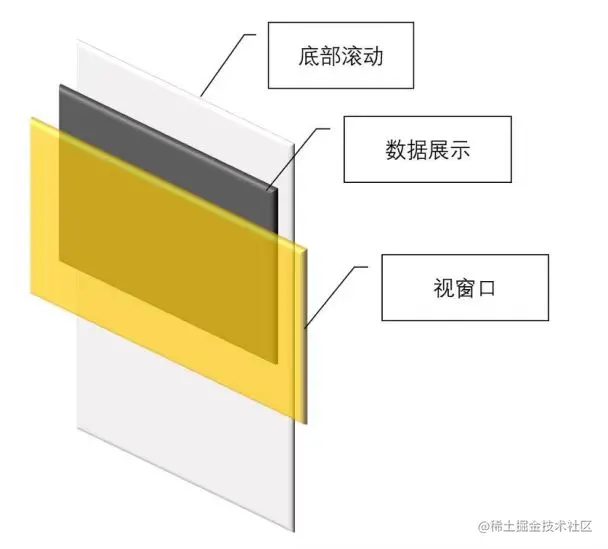 由此可知,根据滚动容器元素的可视窗口来渲染长列表中的部分数据。利用视差和错觉制作一份出一份“虚拟”列表,一个虚拟列表由三部分组成: