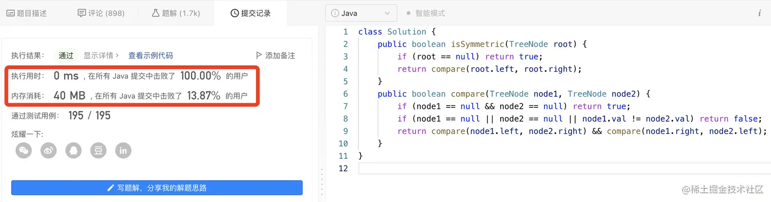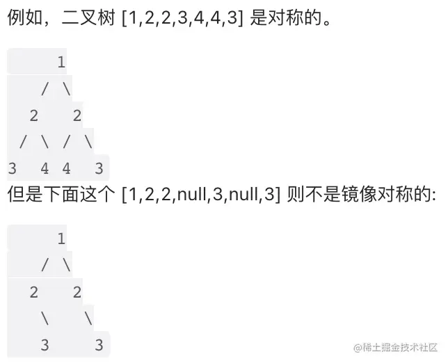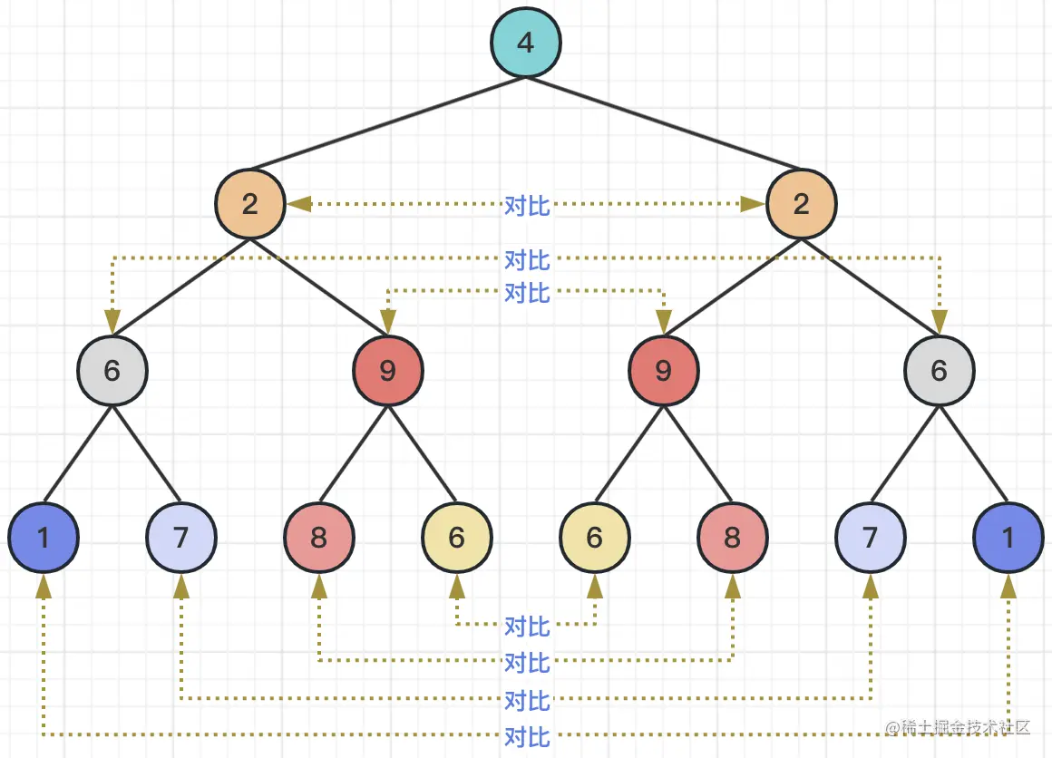 根据题目描述,我们需要确定某个二叉树是否是对称二叉树。那么以第二层Node节点为例,符合对称二叉树的条件就是Node.left.left等于Node.right.right,并且Node.left.right等于Node.right.left,并且通过递归的方式,对每层的节点都进行对比操作。