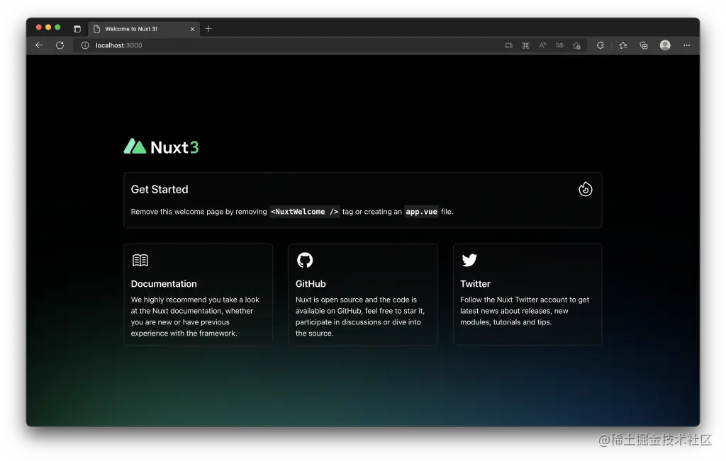 如果看到如下图的欢迎画面,恭喜你!我们已经成功建立第一个 Nuxt 3 项目咯!