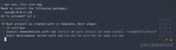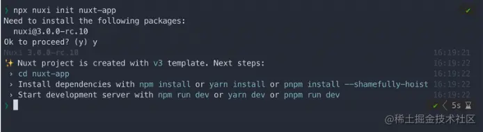 如下图,npx 会询问你是否安装最新版本的套件 nuxi@3.0.0-rc.10 输入 y 即可。