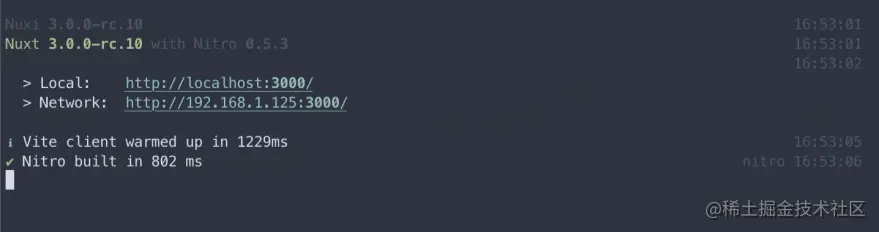 如果没有意外,可以看到 Nitro 帮我们启动了 Nuxt 3 的服务。
