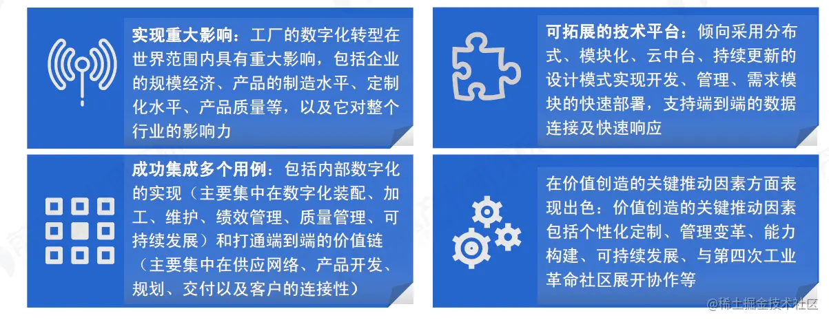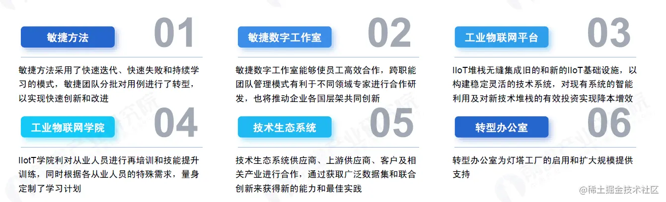 灯塔工厂是第四次工业革命的成功实践者,通过分享其数字化智能化转型经验,为传统工业企业的数字化转型照亮前进方向。《全球灯塔网络:具有社会责任的行业转型实践指南》认为,灯塔工厂成功实现第四次工业革命转型的六大核心要素包括敏捷方法、敏捷数字工作室、工业物联网平台、工业物联网学院、技术生态系统和转型办公室。