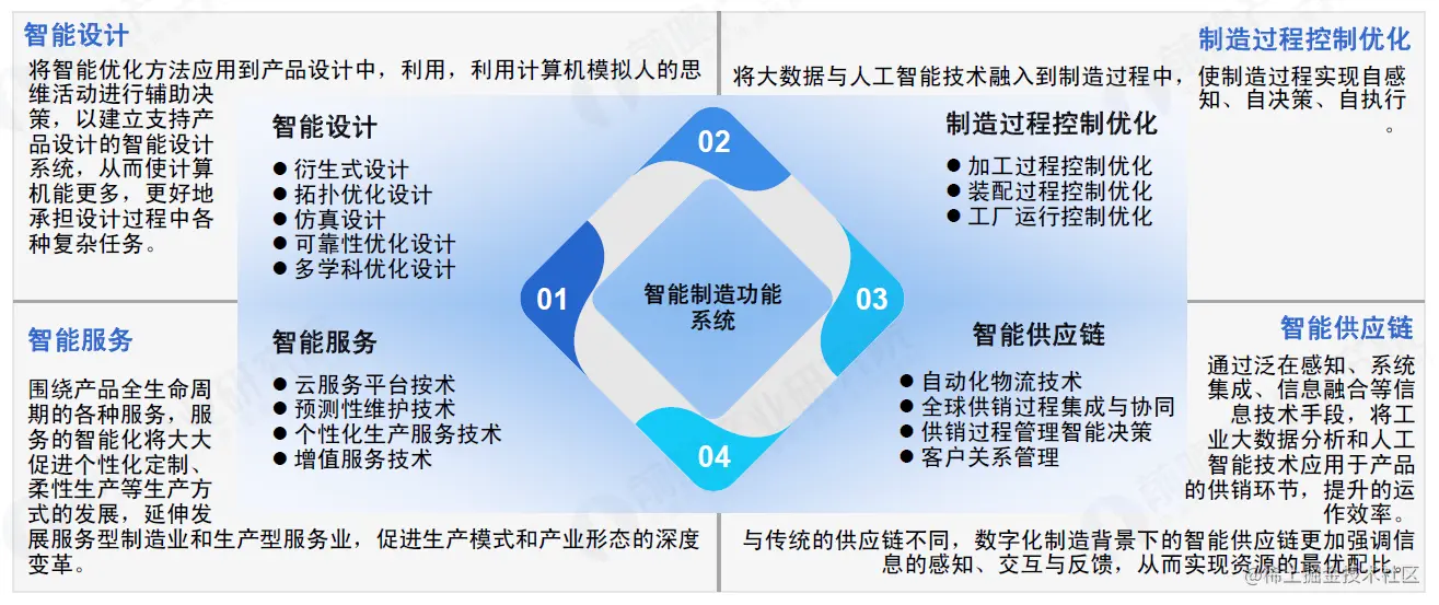 智能制造的主要功能系统包括智能设计、制造过程控制优化(包括加工过程、装配过程、工厂运行等)、智能供应链、智能服务等。