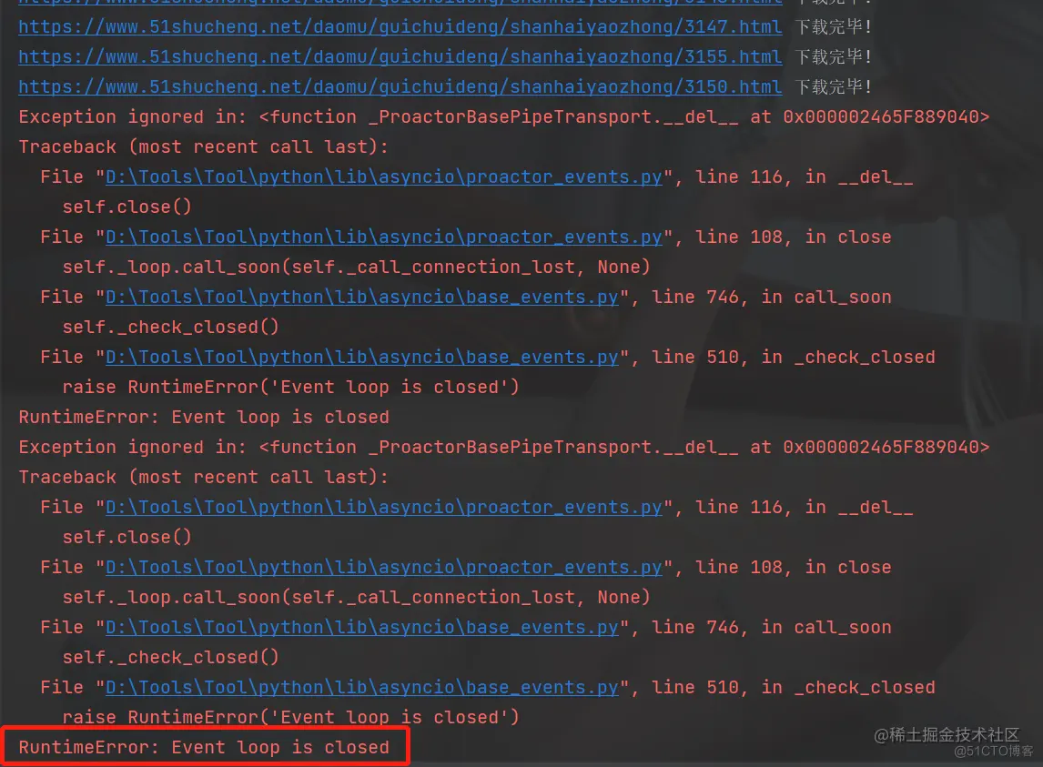 主函数运行就没什么可说的了,这里注意一点就是最后不要loop.close(),这样的话会导致你还没有爬取完数据,loop.close()就会关闭,情况如下,还剩一点就爬完了,结果报错了