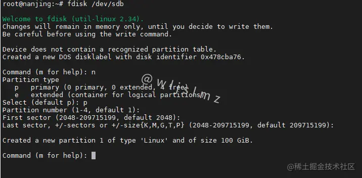 这个时候就看了我们创建了一个新的分区,大小为100G。
