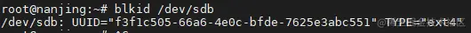 可以查看到/dev/sdb的唯一编号,我们需要将这个唯一编号写入到fstab文件。