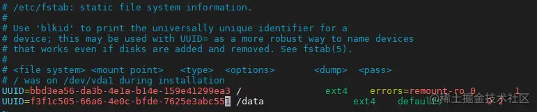 UUID=f3f1c505-66a6-4e0c-bfde-7625e3abc551 /data ext4 defaults 0 2