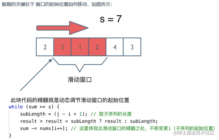 滑动窗口的精妙之处在于根据当前子序列和大小的情况,不断调节子序列的起始位置。从而将O(n^2)暴力解法降为O(n)。