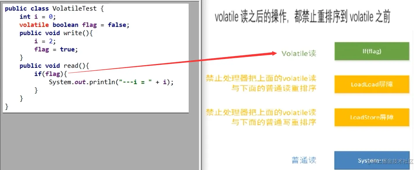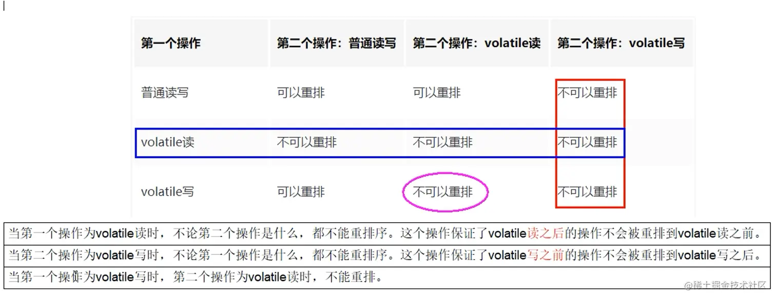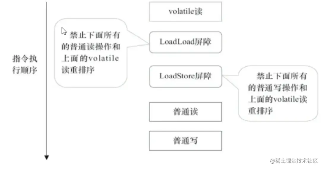 - 禁止下面的所有普通读操作和上面的 volatile 读重排序