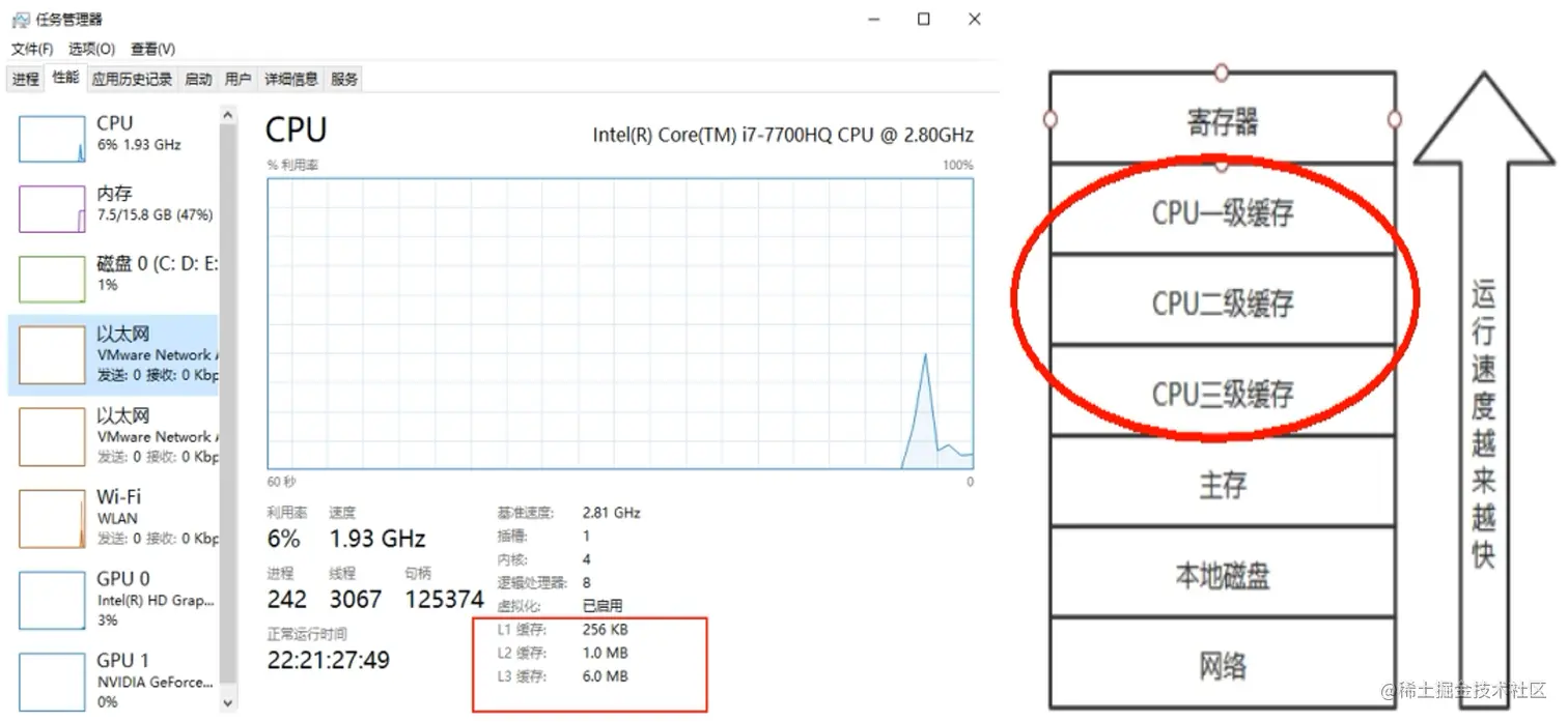 硬件体系中存在多级的缓存,越往寄存器,则运算速度越快。