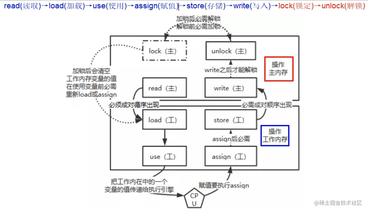 - write:作用于主内存,将 store 传输过来的变量值赋值给主内存的变量;