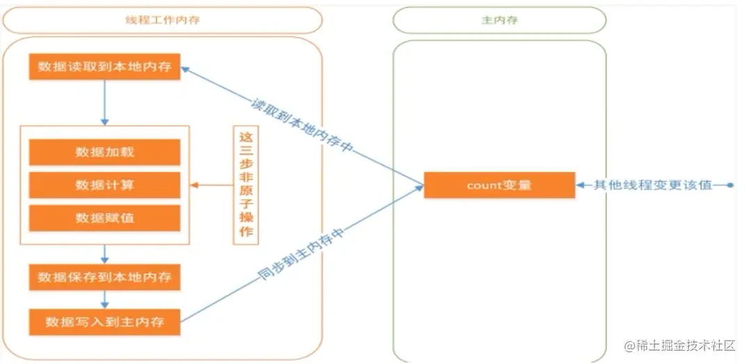 对于 volatile 变量具备可见性,JVM 只是保证从主内存加载到线程工作内存的值是最新的,也仅是数据加载时是最新的。但是多线程环境下,”数据计算“ 和数据赋值操作可能多次出现,若数据在加载之后,若主内存 volatile 修饰变量发生修改之后,线程工作内存中的操作将会作废去读主内存最新值,操作出现丢失问题。即各个线程私有内存和主内存公共内存中的变量不同步,进而导致数据不一致。
