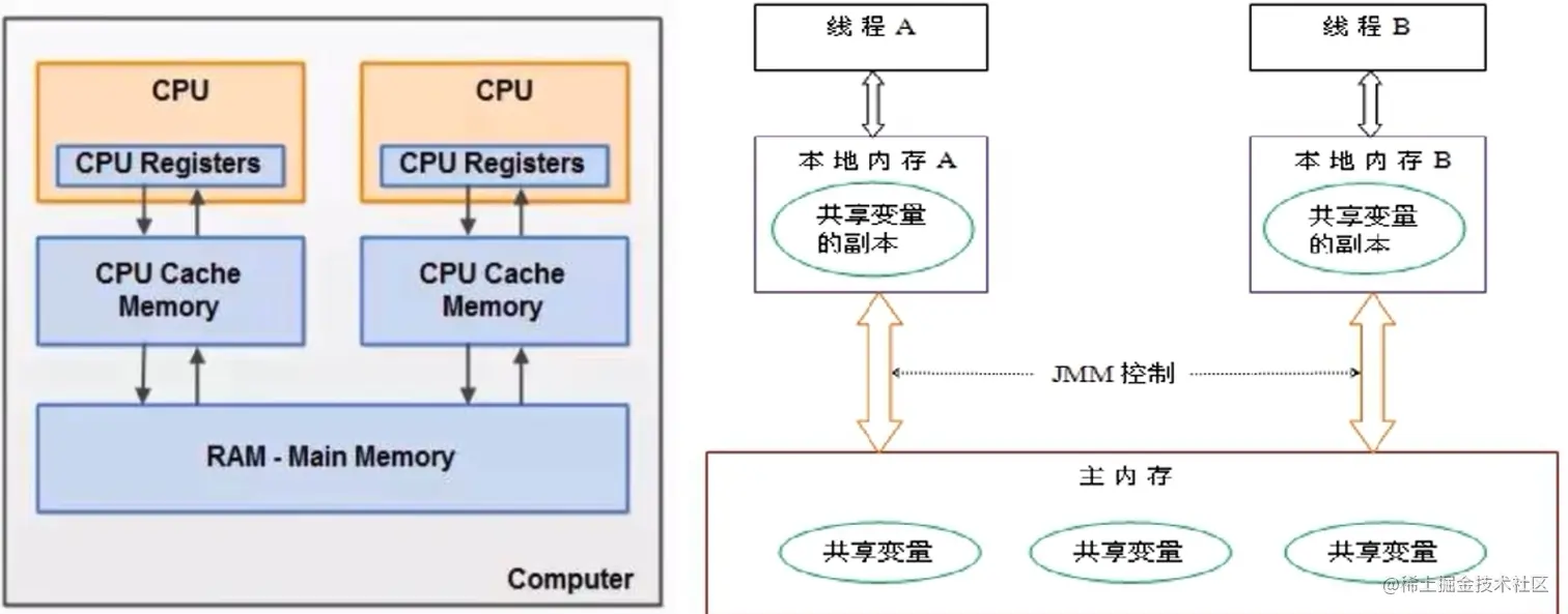 ① 线程之间的共享变量存储在主内存中(从硬件角度来说就是内存条)