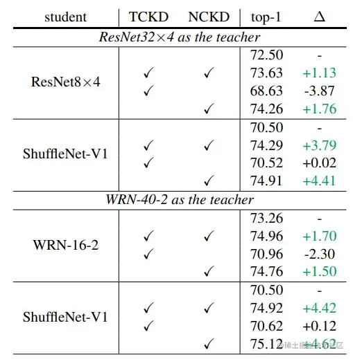 表 2 使用数据增强的情况下,添加 TCKD 带来的性能收益,性能指标为 top-1 准确率