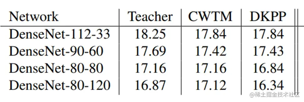 表 3 CWTM 和 DKPP 用在不同模型上的蒸馏结果,性能指标为错误率,越小越好