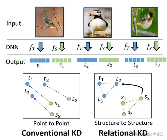 以 RKD 算法为例,其核心思想如下图所示。RKD 认为关系是一种更 high-level 的信息,样本之间的关系差异信息优于单个样本在不同模型的表达差异信息,其中关系的差异同时包含两个样本之间的关系差异和三个样本之间的夹角差异。
