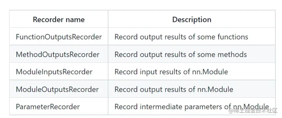 Recorder 机制更是实现了 function、method、model和parameter 等各类信息的“无痛”获取,大家不需要额外进行代码编写,只需要稍微更改 config 配置便可获取你想要的信息。