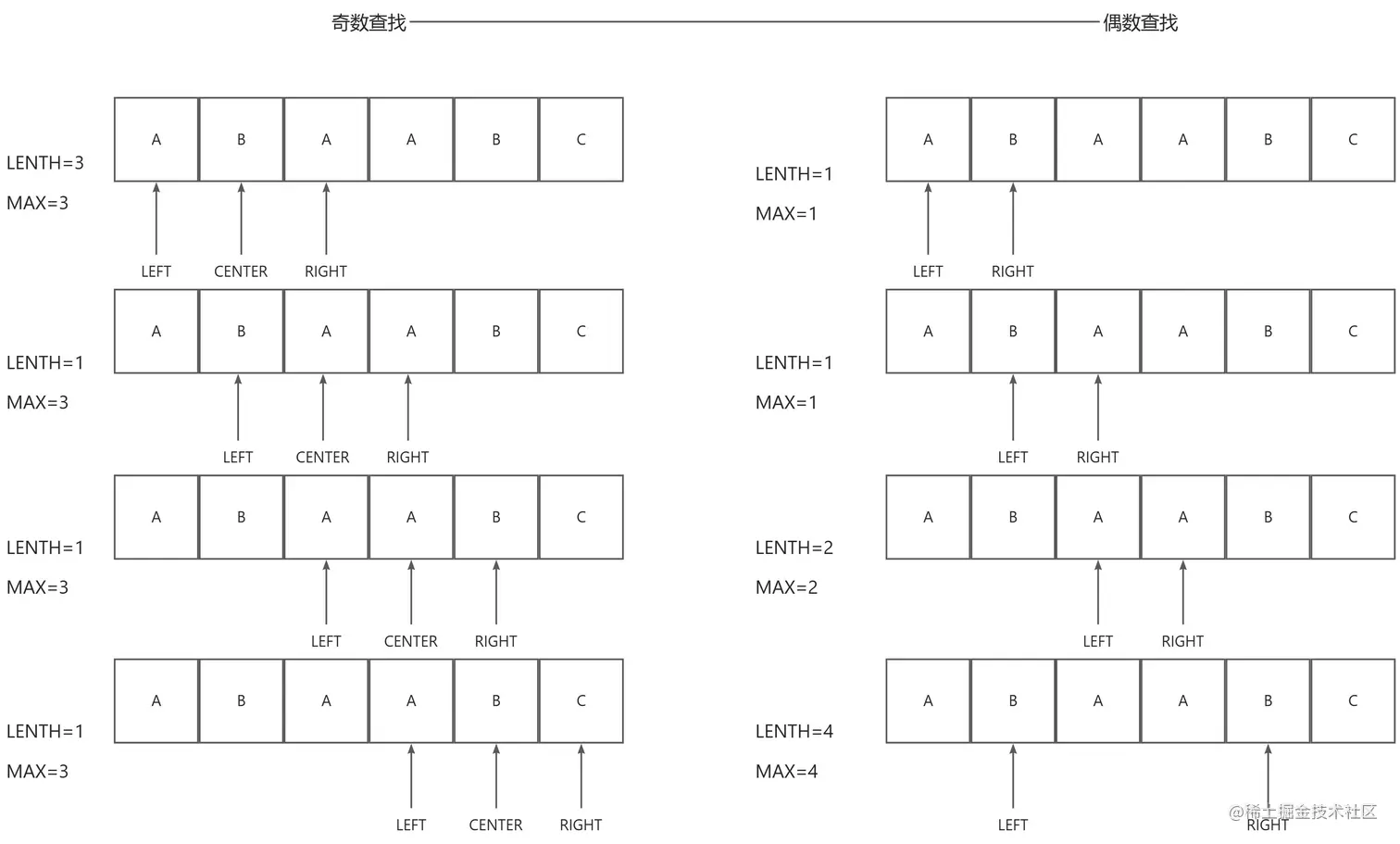 *LEFT和*RIGHT是否相等,并判断LEFT是否大于等于0,RIGHT要小于字符串长度-1- 如果相等,LEFT和RIGHT向两端扩展,并继续这一步的判断