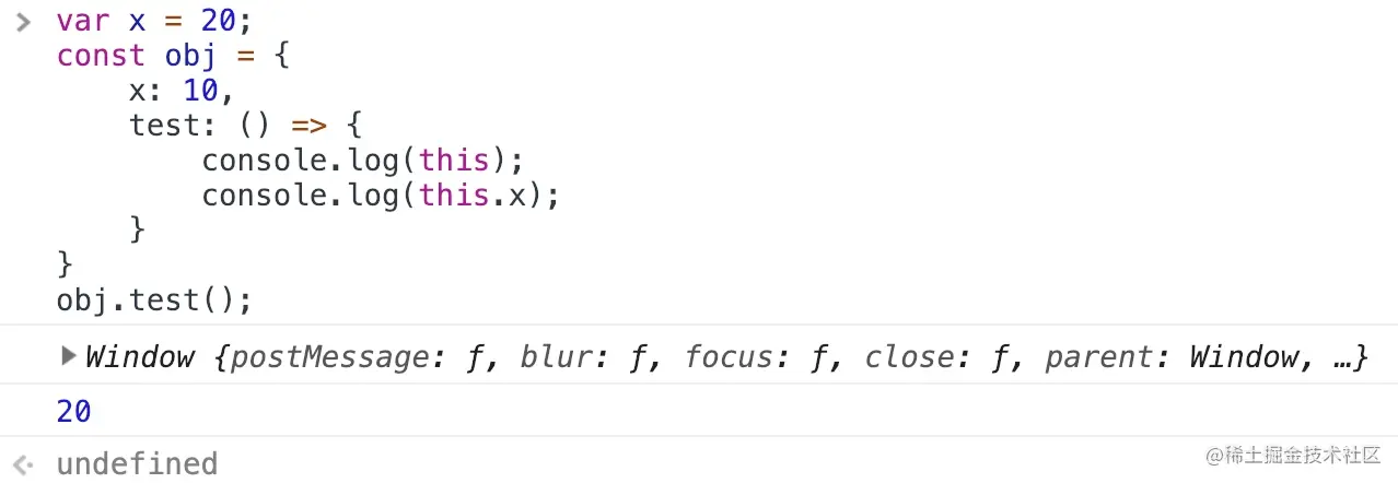 实际上刚才我们有讲过,箭头函数的 this 指向与普通函数不一样,它的 this 指向始终是指向的外层作用域。所以这里的 this 实际上是指向的全局对象。
