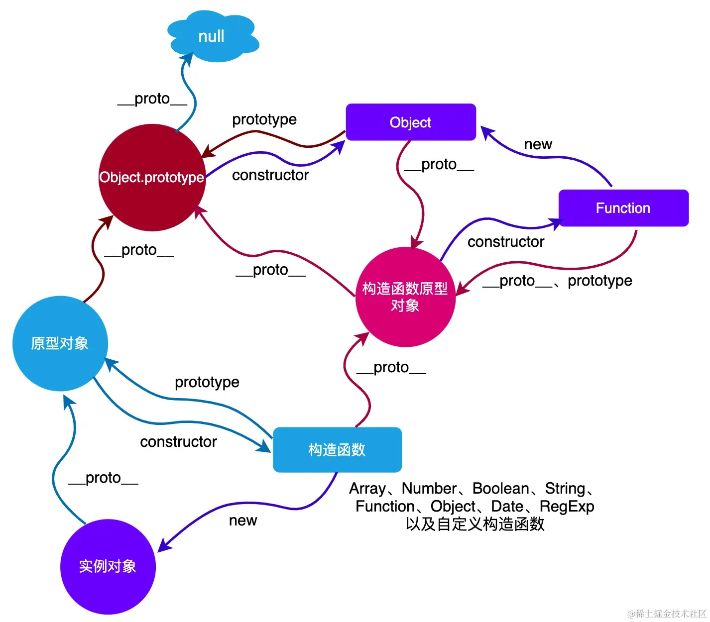 - 构造函数的 prototype 属性指向一个对象,这个对象是该构造函数实例化出来的对象的原型对象。