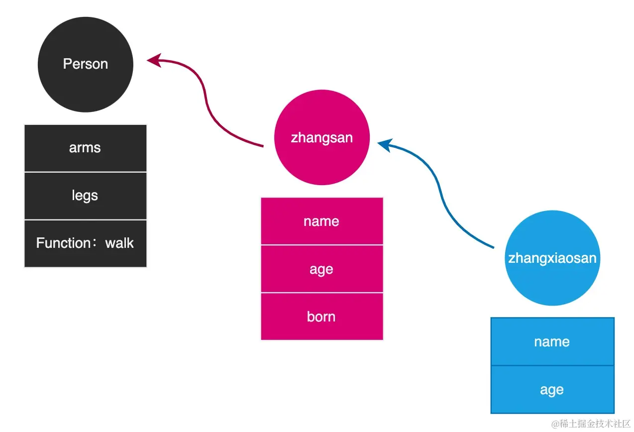 该例中,zhangsan 这个对象是从 person 这个对象克隆而来的,而 zhangxiaosan 这个对象又是从 zhangsan 这个对象克隆而来,以此形成了一条原型链。无论是 person 对象,还是 zhangsan 对象上面的属性和方法,zhangxiaosan 这个对象都能继承到。
