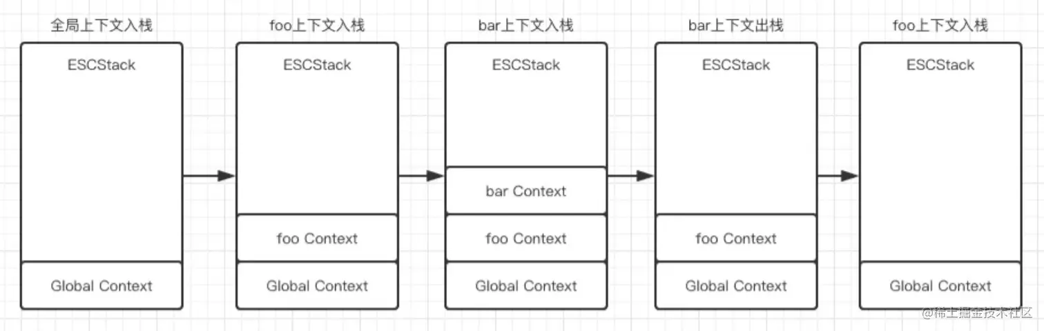 程序执行进入一个执行环境时,它的执行上下文就会被创建,并被推入执行栈中(入栈);程序执行完成时,它的执行上下文就会被销毁,并从栈顶被推出(出栈),控制权交由下一个执行上下文。